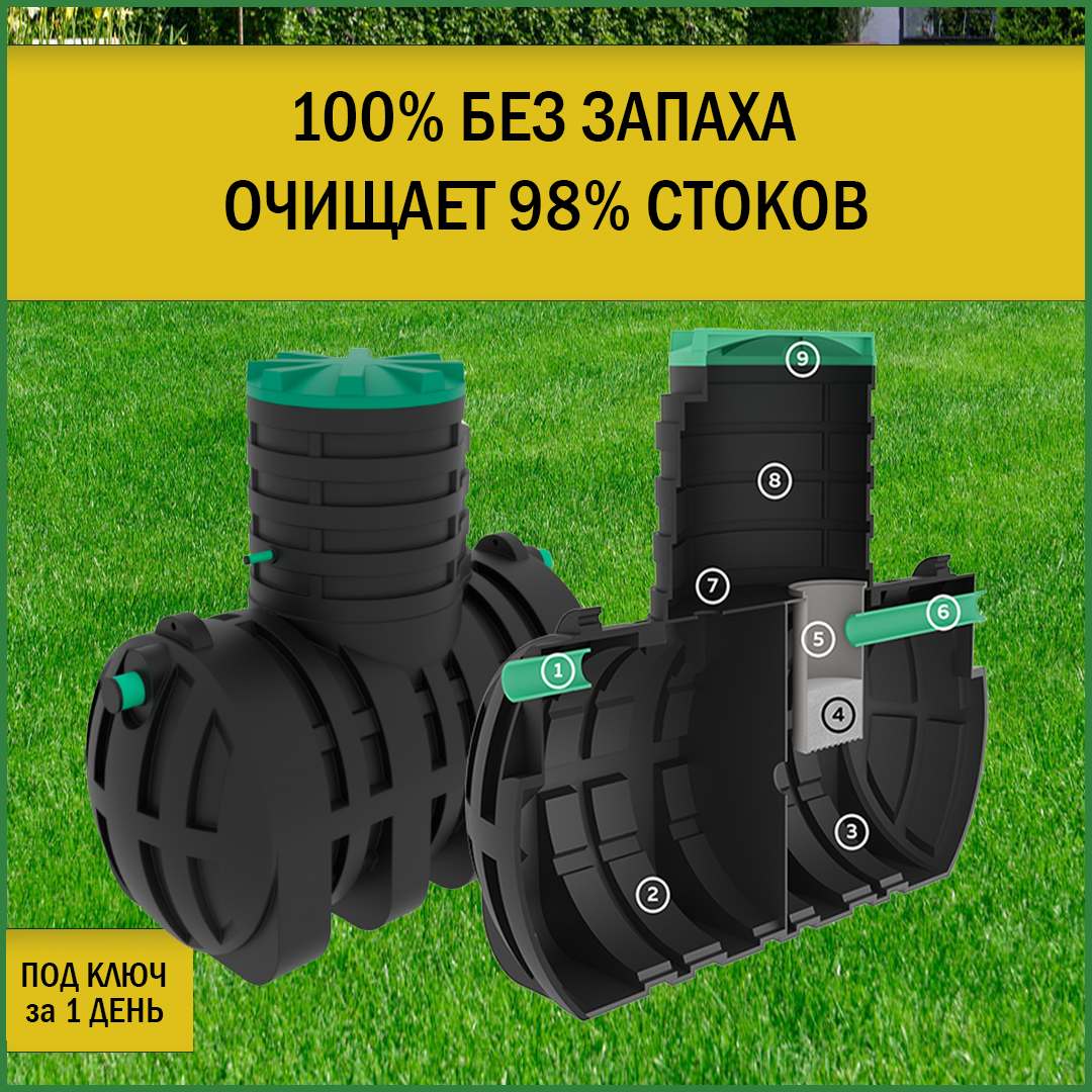 Корпус септика изготовлен из прочного материала, который не ржавеет, не разрушается под действием температур и имеет большую химическую стойкость и поэтому служит более 50 лет.