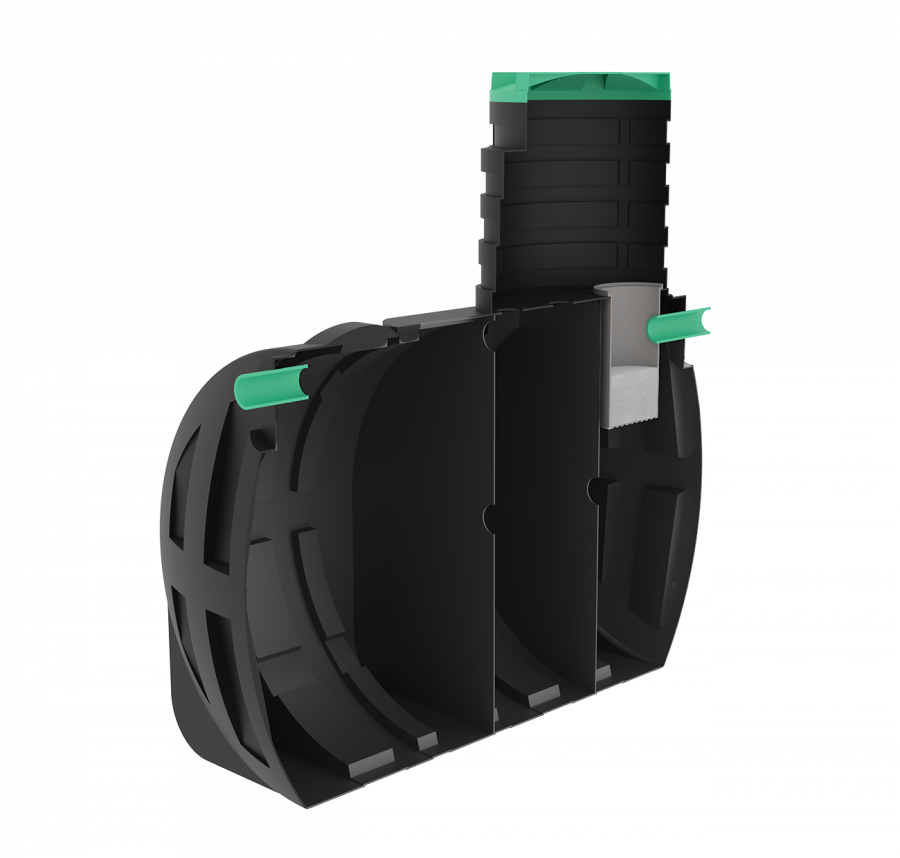Все сточные воды, идущие от раковин, унитазов, посудомоечной и стиральной машин, направляются в первую секцию септика. В ней происходит отстаивание жидкости с выпадением на дно твердых частиц. Одновременно, на поверхности жидкости образуется пленка жира. Когда уровень жидкости достигает определенного уровня, она переливается через патрубок во вторую камеру. Патрубок устроен так, чтобы осадки и жировая пленка не перетекали в следующую камеру.